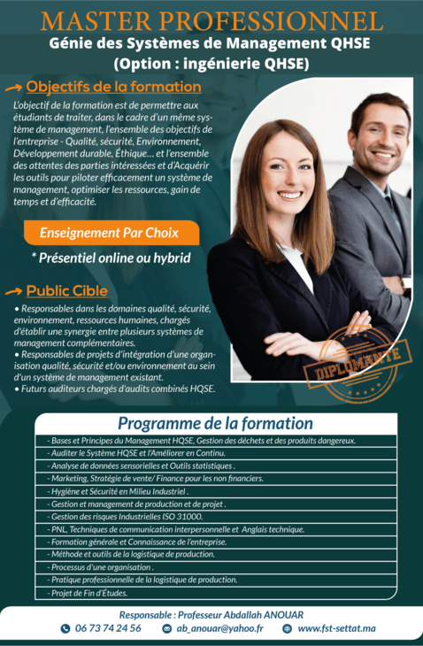 MASTER : GÉNIE DES SYSTÈMES DE MANAGEMENT DE LA QUALITÉ, DE LA SÉCURITÉ ET D'ENVIRONNEMENT GSMQSE (SPÉCIALITÉ INGÉNIERIE QHSE)