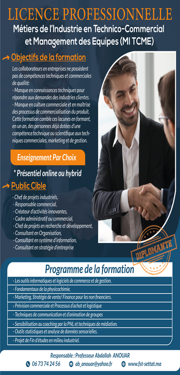 LICENCE : MÉTIERS DE L'INDUSTRIE EN TECHNICO-COMMERCIAL ET MANAGEMENT DES ÉQUIPES