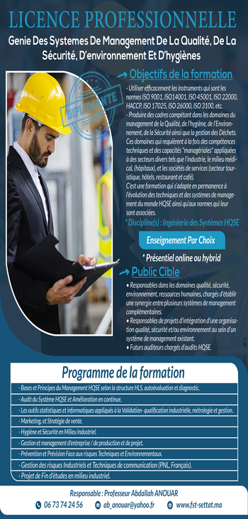 LICENCE : GÉNIE DES SYSTÈMES DE MANAGEMENT DE LA QUALITÉ, DE LA SÉCURITÉ ET D'ENVIRONNEMENT GSMQSE (Spécialité Ingénierie QHSE)